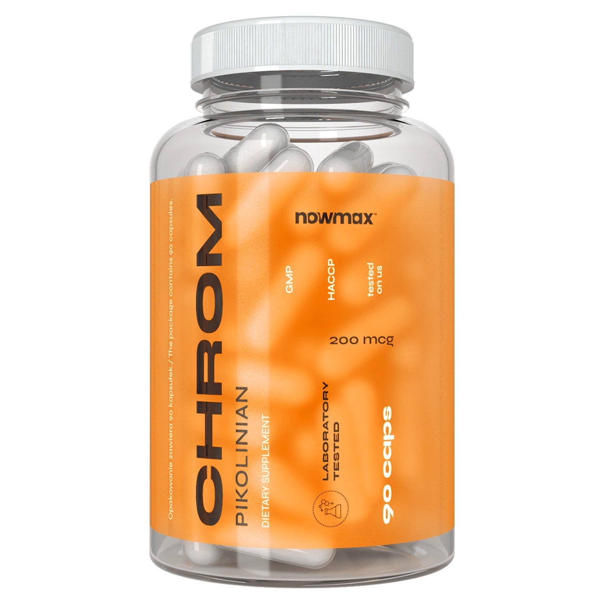 nowmax® Chrom to suplement diety zawierający pikolinian chromu o wysokiej biodostępności, zamknięty w wygodnych kapsułkach. Chrom w tej formie wspiera prawidłowe funkcjonowanie metabolizmu makroskładników, takich jak białka, tłuszcze i węglowodany. Obecność kwasu pikolinowego zwiększa wchłanialność składnika aktywnego, co czyni go wyjątkowo skutecznym wsparciem codziennej diety.