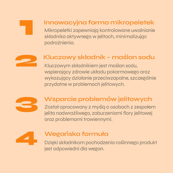 - Innowacyjna postać mikropeletek gwarantująca celowane i stopniowe uwalnianie maślanu sodu w jelitach.